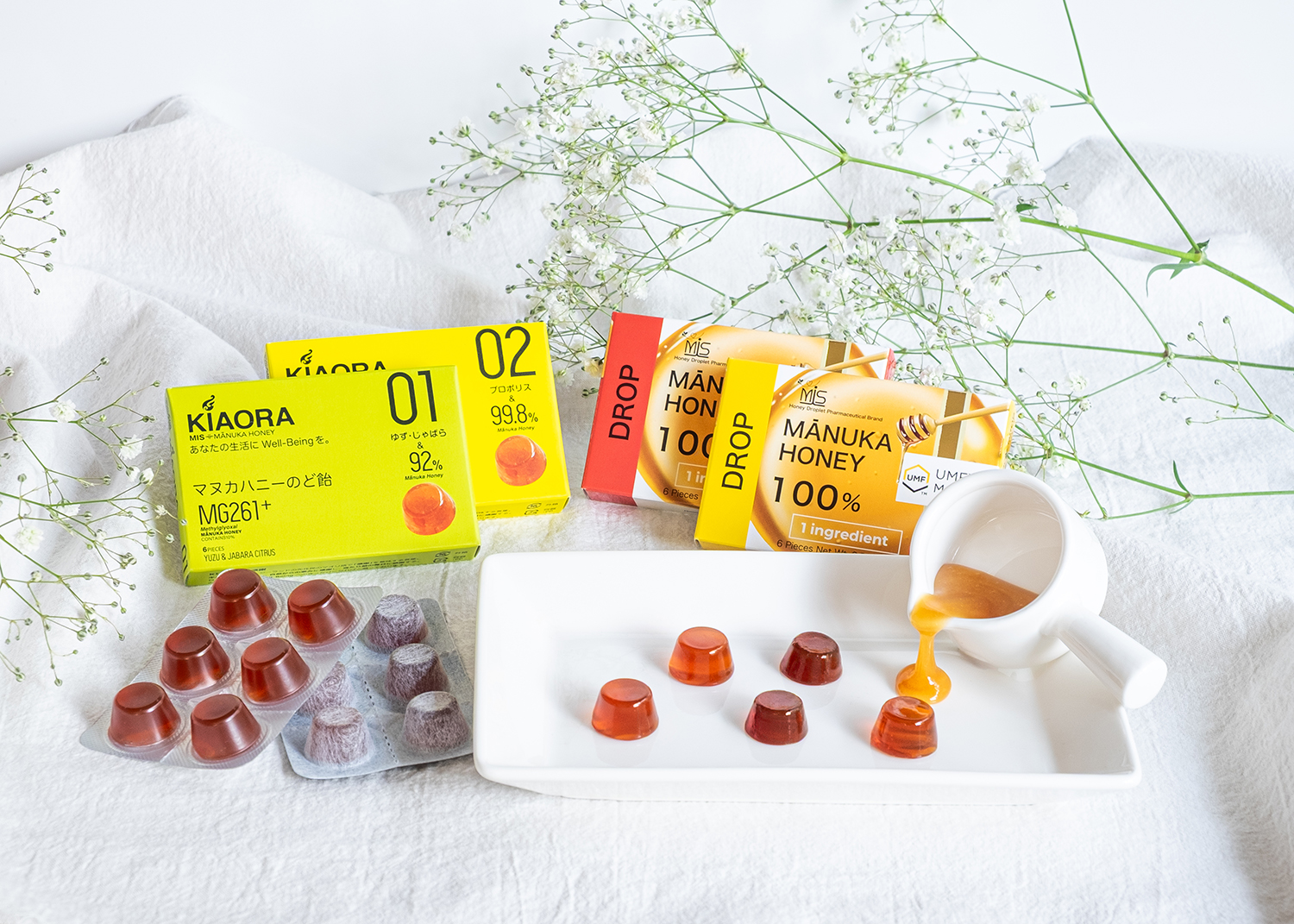 オリジナル商品として養蜂家の夢であった100%マヌカハニーを固形化した「ロゼンジ」と独自の調合による、マヌカハニーと素材の自然の恵みだけで作った、 砂糖・水飴・添加物不使用 の「のど飴」も販売しています。
